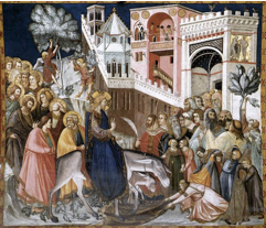 Zoals de kleur daarna wisselt van rood naar paars, zo wisselt de juichstemming naar een stemming van het lijden, wanneer het ervangelie wordt gelezen door drie personen van het lijden en sterven van onze Heer Jezus Christus.