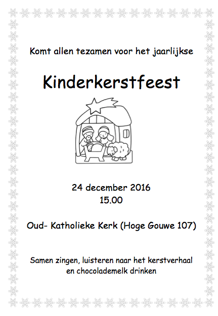 Het kerstverhaal wordt verteld door Ellen Dekker. Zij vertelt het verhaal door de ogen van de ezel in de stal. Het verhaal is geschikt voor alle kinderen tot ongeveer groep 8. Tussendoor zingen we kerstliedjes onder het genot van warme chocolademelk. Samen gaan we de Kerststal inrichten. Jullie zijn vanaf 14:45 uur van harte welkom in de Oud-Katholieke kerk Hoge Gouwe 107 2801 LD Gouda.
