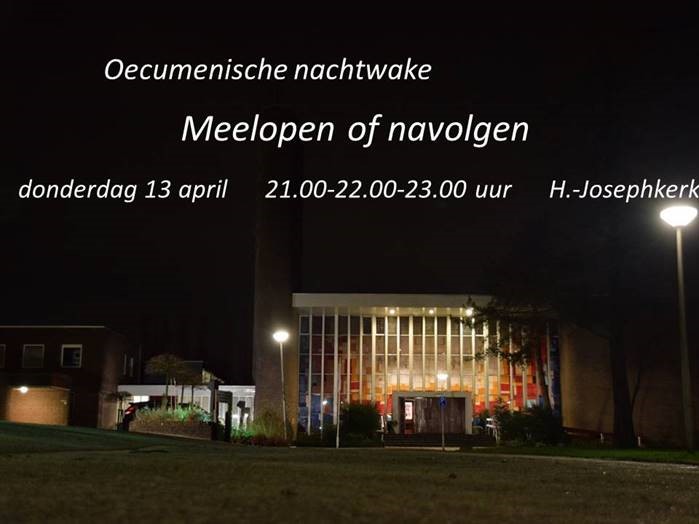 Komende donderdag 13 april, Witte Donderdag, is er een oecumenische nachtwake in de H.-Josephkerk aan het Aalberseplein. Je bent van harte welkom. De nachtwake heeft als thema Meelopen of navolgen. De nachtwake verbindt dat wat in de wereld op dit moment gebeurt, met het gedenken van de laatste avond van Jezus’ leven in Jeruzalem. Welke keuze maak je? We staan stil bij de worsteling van Jezus, de worsteling van Pilatus en de worsteling van onszelf.